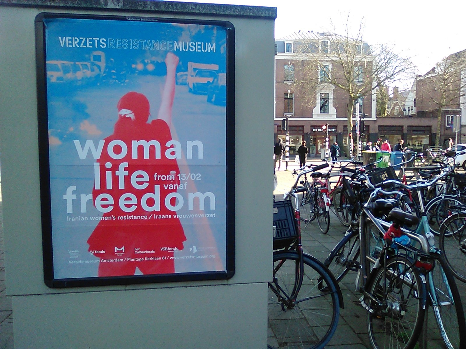 27 maart 2026 Woman, Life, Freedom 3 Exposition Woman, Life, Freedom in Resistance Museum Amsterdam. Interview with curator of exposition on Iranian women’s resistance in Folia, universiteitskrant van de UvA ( in Dutch ). Photo shows Publicity poster Woman, Life, Freedom, streetview Amsterdam March 26, 2026. |